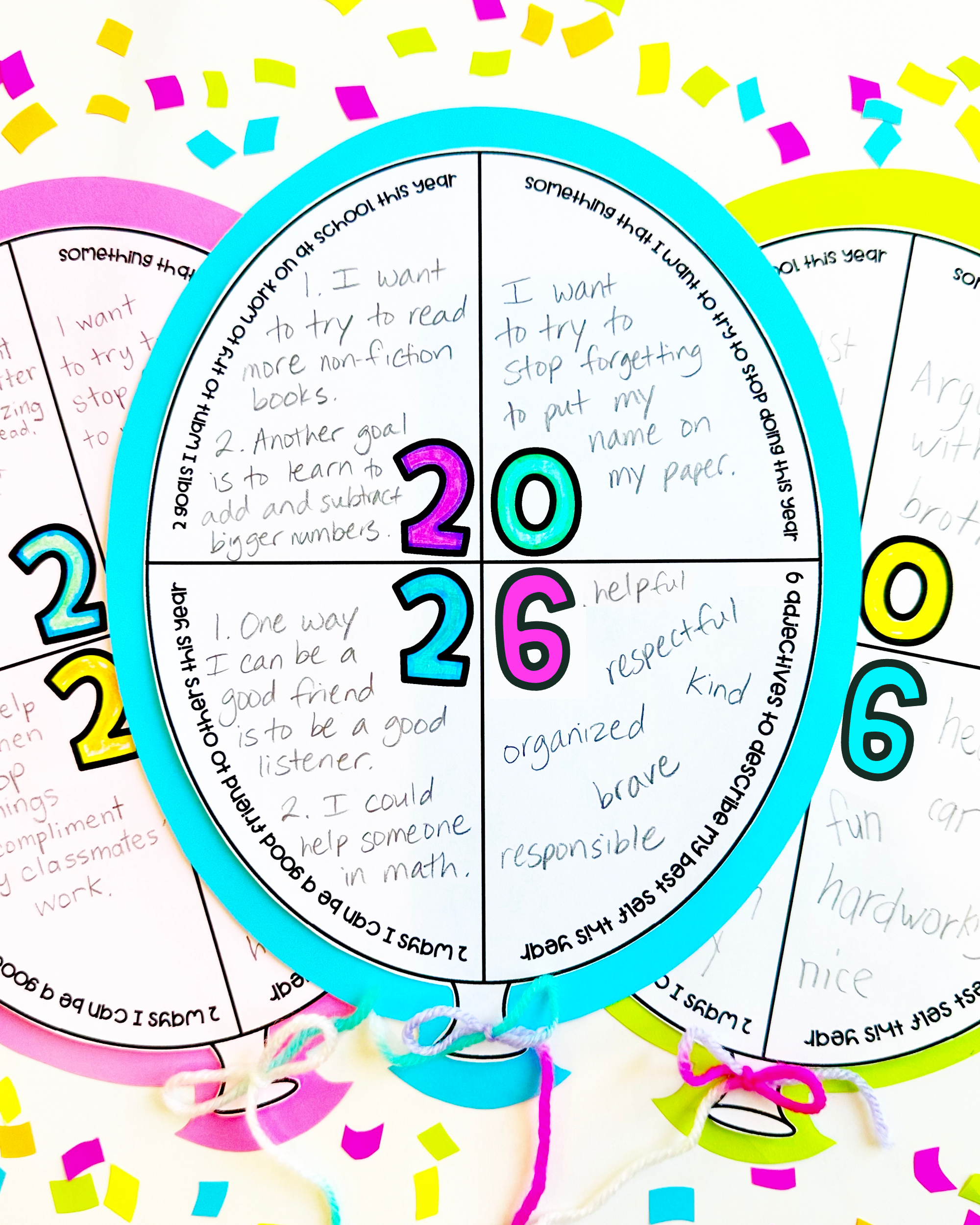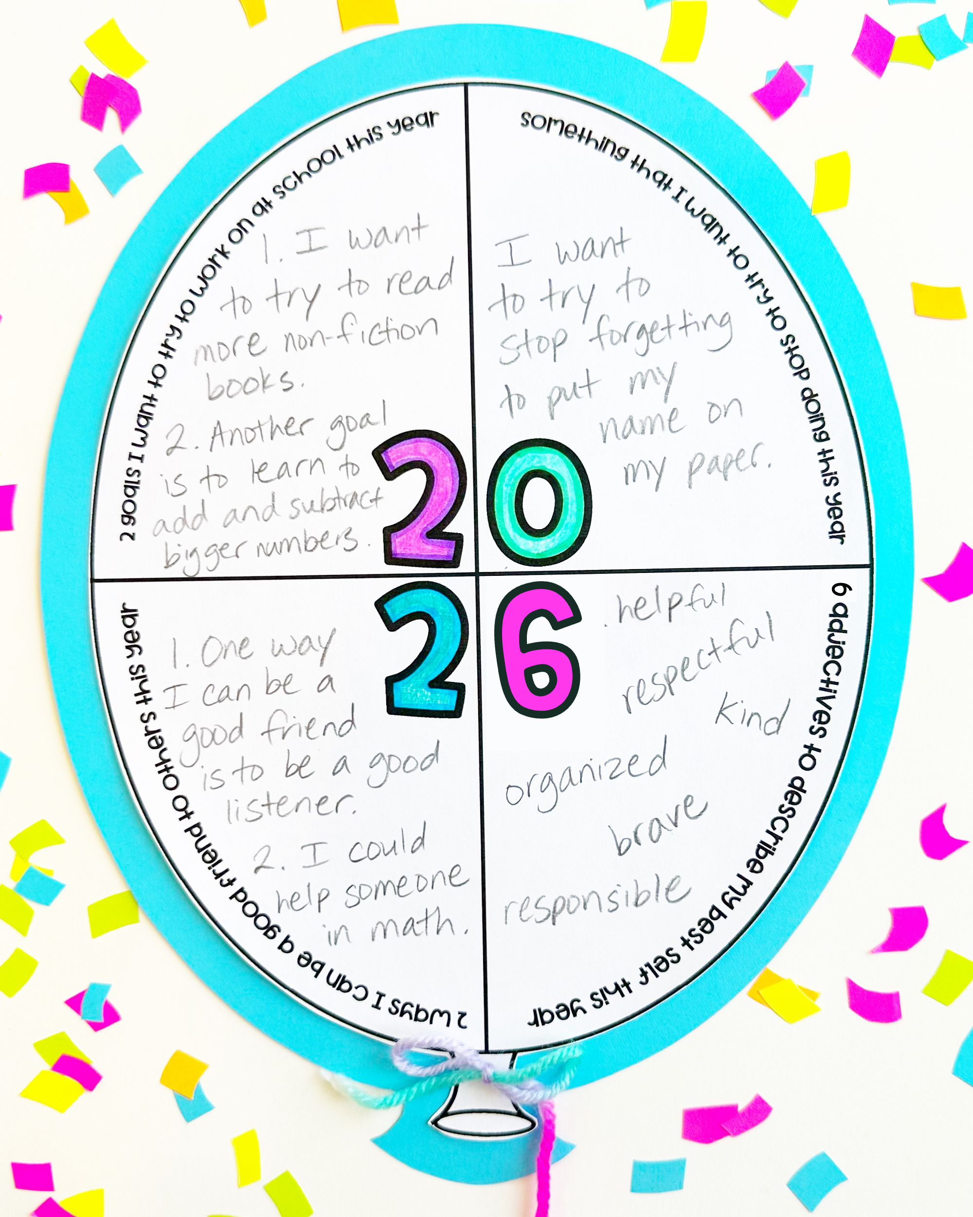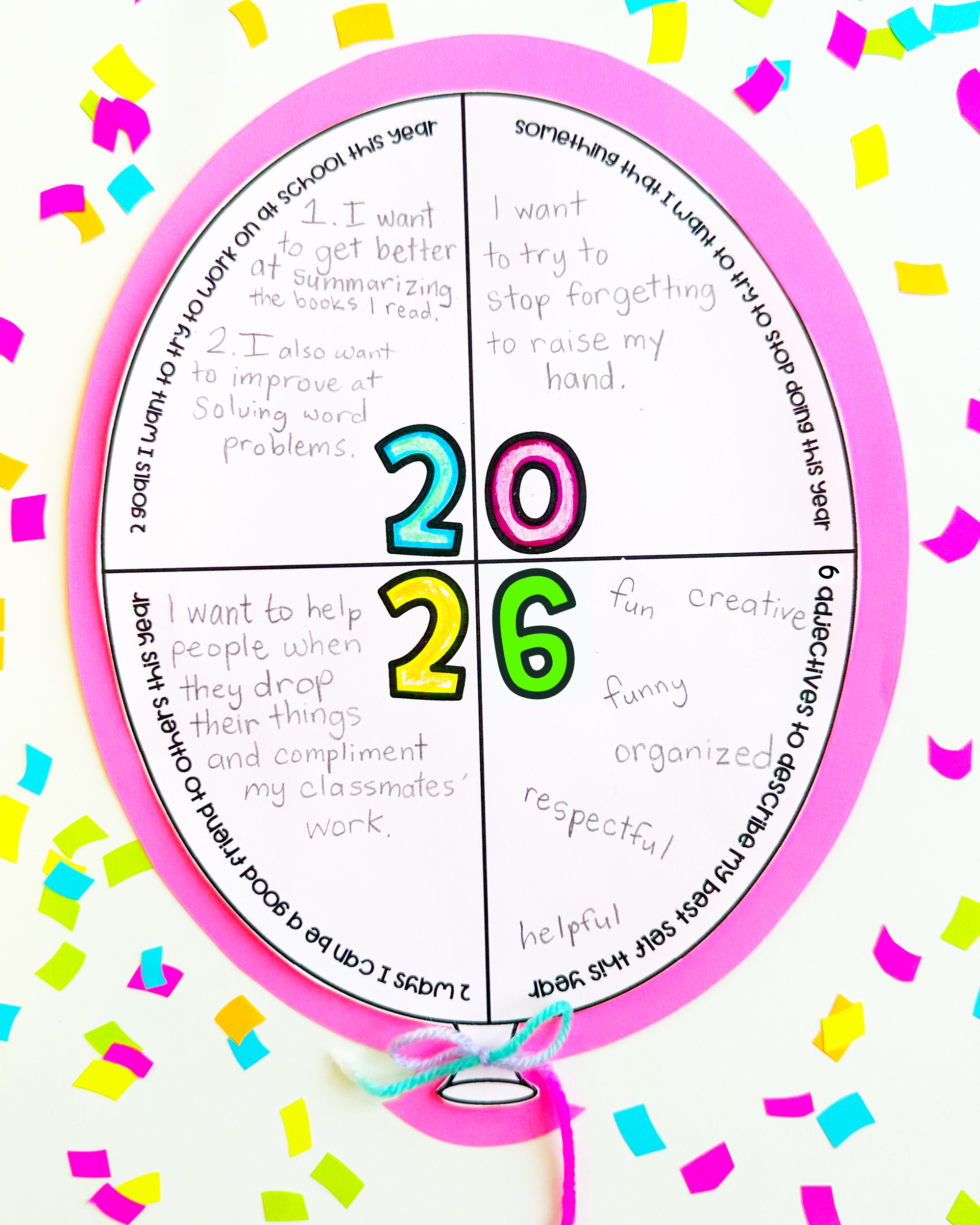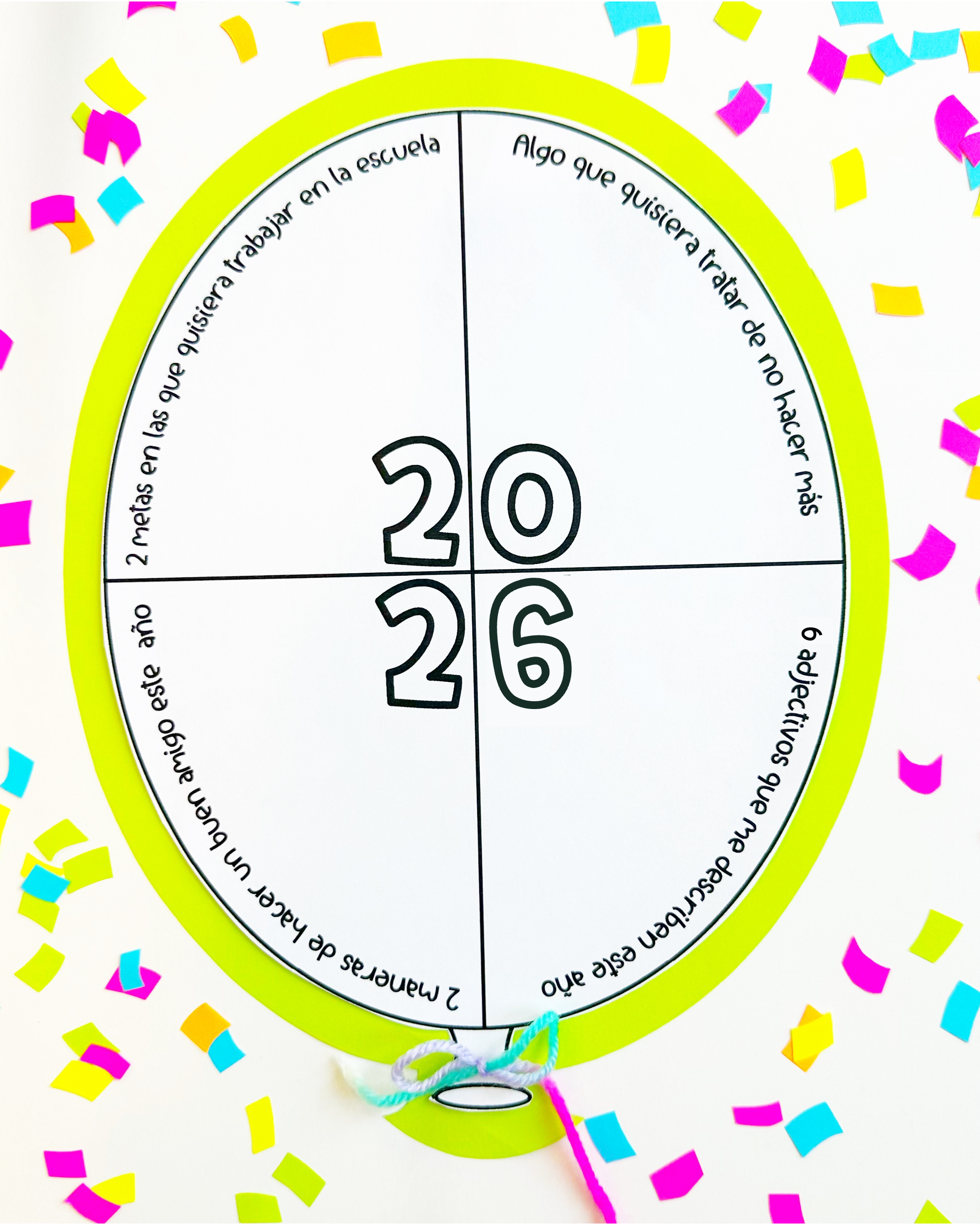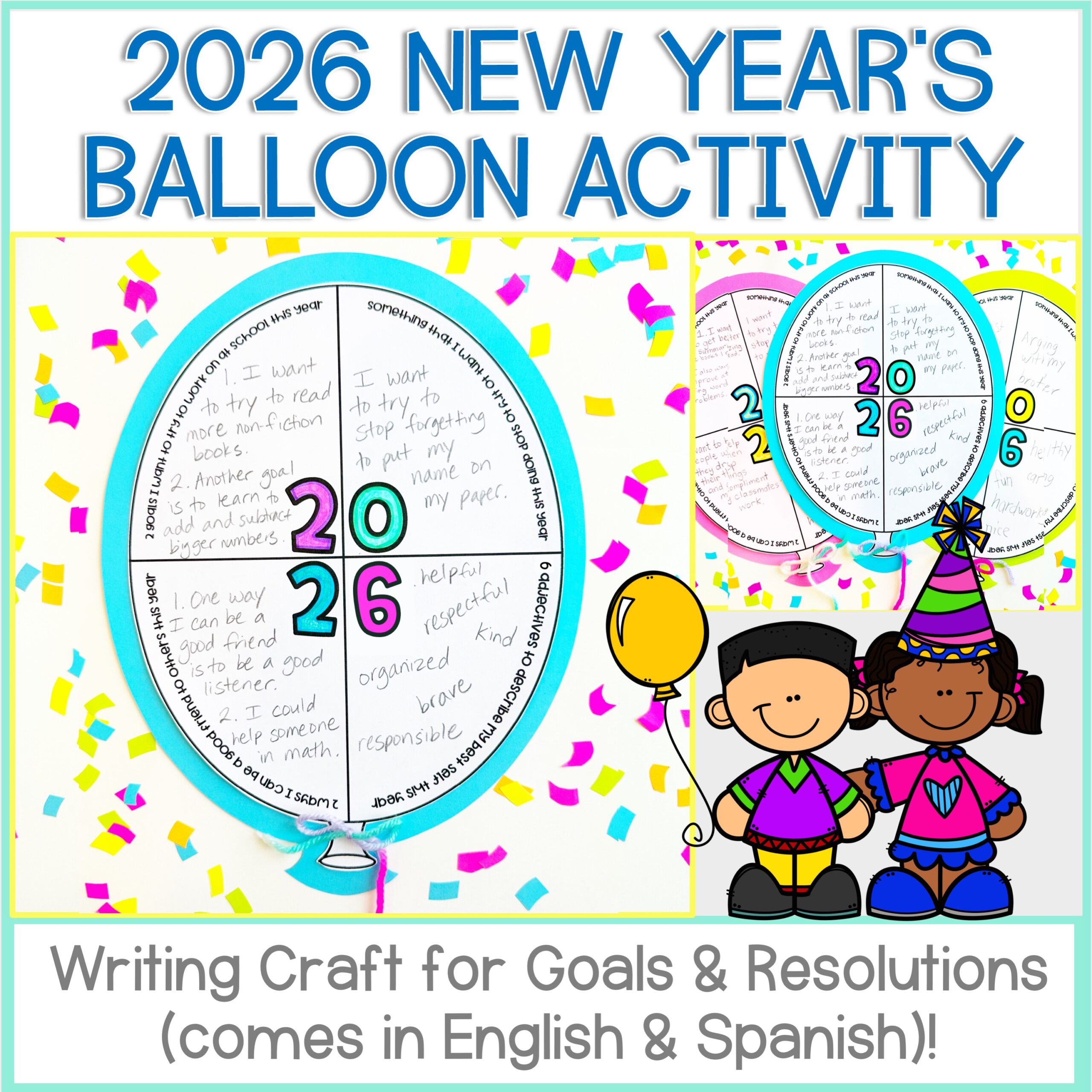 Your class can celebrate 2026 with this festive new year’s activity! Student set new year’s resolutions and goals with this balloon writing craft. Templates are available in both English and Spanish.