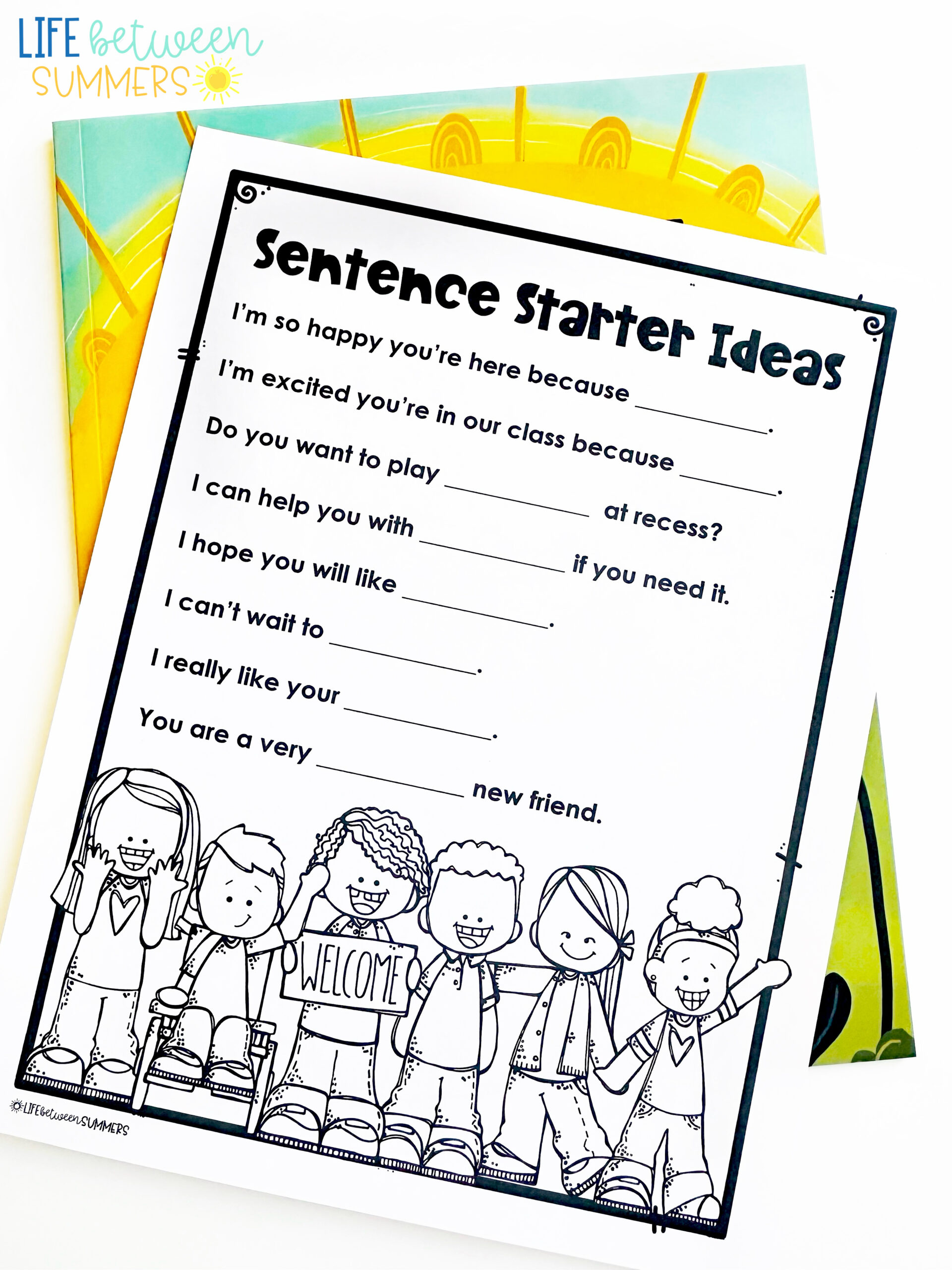 Tip: Before having students start on their writing, brainstorm ideas together as a class (sharing examples of compliments and welcoming messages). A list of sentence frame starters is included with this book companion resource too, in case you might like to display it on the board during their independent writing time.